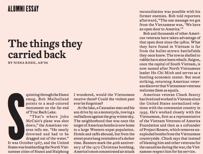 Articles, Chicago, Veterans, VietnamMy essay about American and Vietnamese veterans working together on unexploded ordinance in Vietnam was published this week in The University of Chicago Magazine. You can read the article online here or in its magazine form here on page 60.
